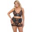 Schwarzes Straps-Set von Cottelli CURVES mit BH, Slip ouvert und Strapsgürtel mit Strumpfbändern. Aus weicher elastischer Spitze mit Stretcheinsätzen für perfekte Passform mit hohem Tragekomfort. Roségoldfarbene Accessoires runden den eleganten Look ab. BH mit Schmuckketten im Dekolleté und Herz-Schmuckanhänger zwischen den soften Spitzen-Cups. Die Träger und der Hakenverschluss im Rücken sind passend verstellbar. Strapsgürtel mit Schmuckkettchen vorne. Im Rücken verstellbarer Hakenverschluss. Die elastischen Spitzen-Strumpfbänder sind mit Ringen am Strapsgürtel befestigt. Der Spitzen-Slip verführt mit seinem offenen Schritt.