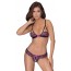 Soft-BH und Slip ouvert aus weicher elastischer 2-farbiger Spitze mit Schleifen-Verzierung in den Fronten. BH mit ¾-Cups, die knapp die Brustwarzen bedecken, hinten mit Clipverschluss, Träger verstellbar. Slip im Schritt komplett offen - auch über dem Po.