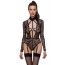 Langarm-Riobody von Cottelli LINGERIE komplett aus feiner weicher Spitze mit raffinierten Details im Mattlook. Rundum elastisch und soft anschmiegsam für hautnahen Sitz mit höchsten Tragekomfort. Vorne bis zum Bauchnabel tief ausgeschnitten und in provokanter Harness-Optik mit Stretchbändern und Ringen. Auch im großzügigen Rückenausschnitt halten dekorative Stretchbänder alles schön zusammen. Der hohe Spitzenkragen wird im Nacken mit 2 Knöpfen geschlossen. Im Schritt mit Druckknopfverschluss. Die Strumpfhalter sind verstell- und auch komplett abnehmbar.