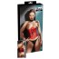 Geize nicht mit Deinen femininen Reizen: busenfreie Lack-Corsage mit Bügeln und eingearbeiteten Stäben, Schnürung im Rücken (nicht zur Taillenreduktion geeignet) sowie Reißverschluss in der Front mit Zierschnürung darüber. Roter Lack mit schwarzer Spitze. Inklusive String. Corsage 90% Polyester, 10% Polyamid, mit Polyurethan-Beschichtung; String 100% Polyester mit Polyurethan-Beschichtung.