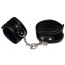 Schöne Handfessel (24 cm x 5 cm) aus Lederimitat. Die Fesseln haben einen Klettverschluss und eine kurze Verbindungskette mit Karabiner (ca. 10 cm). Polyurethan, Metall.