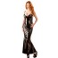 Eng anliegendes, langes Kleid aus schwarzem Lack in ab Kniehöhe ausgestellter Form, mit Reißverschluss und Druckknopf im Rücken sowie verstellbaren Trägern. 100% Polyester mit Polyurethan-Beschichtung.