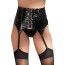 Extrabreiter, schwarzer Lack-Strapsgurt, mit Stäbchen verstärkt. Vorne mit fünf Schnallen verziert, hinten mit 2fach verstellbaren Häkchenverschlüssen. Vier verstellbare Strapsen. Ohne Strümpfe.