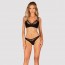 BH und String im schwarzen Set Nesari von Obsessive. Blickdichtes Stretchmaterial im stylischen Mix mit weichem elastischen Netz. BH mit Schmuckelement zwischen den Cups und verstellbarem Hakenverschluss im Rücken. Die raffiniert gekreuzten Doppelträger sind ebenfalls passend verstellbar. Der String verführt mit Netz-Einsätzen und zusätzlichen Riemchen über dem Po.