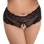 Schwarzer Slip ouvert von Cottelli CURVES komplett aus feiner floraler Spitze. Weich und elastisch für Passformsicherheit und hohen Tragekomfort. Besonders raffiniert ist die elastische, stimulierende Perlenkette im offenen Schritt, sowie die Satinband-Schnürung im großzügigen dreieckigen Po-Ausschnitt.