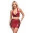 Bauchfreies Neckholder-Top und enger Minirock im Set von Cottelli PARTY. Beides im edlen roten Wetlook mit schwarzen Spitzen-Einsätzen und darüber stylische Riemchen mit silberfarbenen Ringen. Rundum weich und elastisch für höchsten Tragekomfort. Rückenfreies Top mit Druckknopf-Neckholder und Spitzen-Einsatz vorne. Kurzer Rock mit Riemchen geschmückten Spitzen-Einsätzen jeweils seitlich.